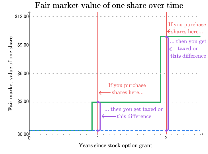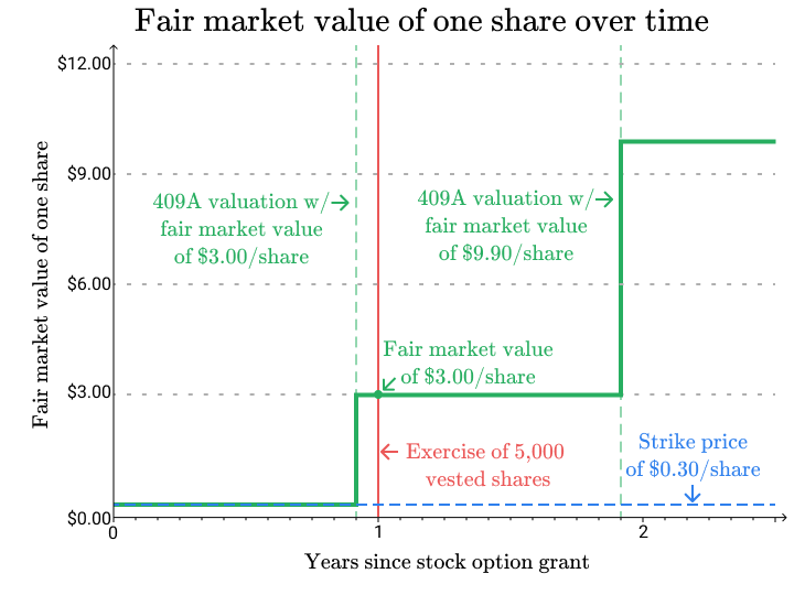 Let’s say that your company has been absolutely crushing it, and since you’ve joined, the company has increased its valuation 10x from $1M to $10M. The valuation that’s relevant here is called the "fair market value" or the "409A valuation", which is sometimes different than the valuation in press releases about venture capital fund raises. Companies are required to get a new 409A valuation at least once every 12 months.