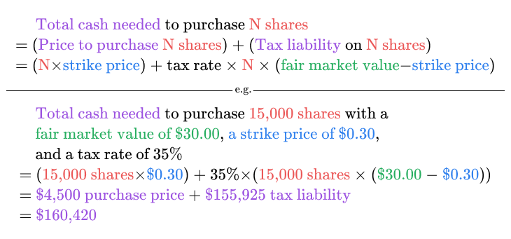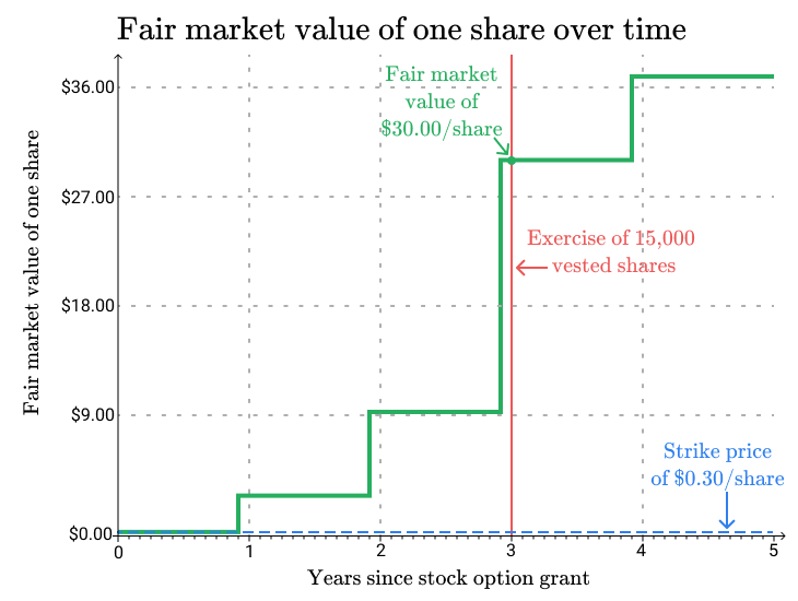 You’ve now vested 3⁄4 of your stock option agreement, allowing you to purchase (3⁄4)⨉20,000=15,000 shares for 15,000⨉$0.30=$4,500. But the IRS now thinks these shares are worth $30.00 each, for a total value of 15,000⨉$30.00=$450,000.