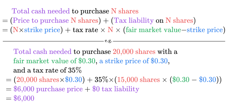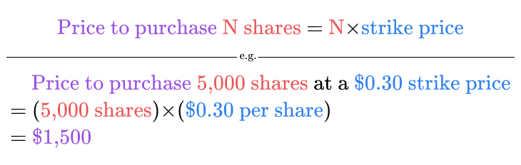 You’ve made it to your 1 year cliff! Congratulations! You’ve earned the right to purchase some of the company stock. Purchasing the stock is called called "exercising the option". Since you have a four year vesting schedule, you now have the right to exercise 1⁄4 of your options. In the above offer, this allows you to purchase 20,000/4=5,000 shares. The purchase cost here is easy to calculate. It’s just the # of shares times the strike price. 5,000⨉$0.30 = $1,500.