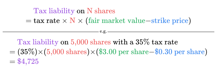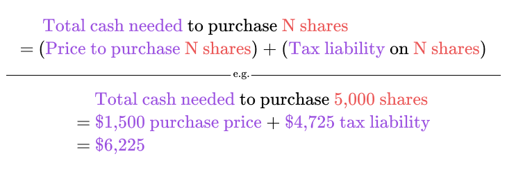 This means you’ll pay around (35%)⨉(5,000)⨉($3.00-$0.30)=$4,725 in taxes on top of the purchase price you pay to the company.