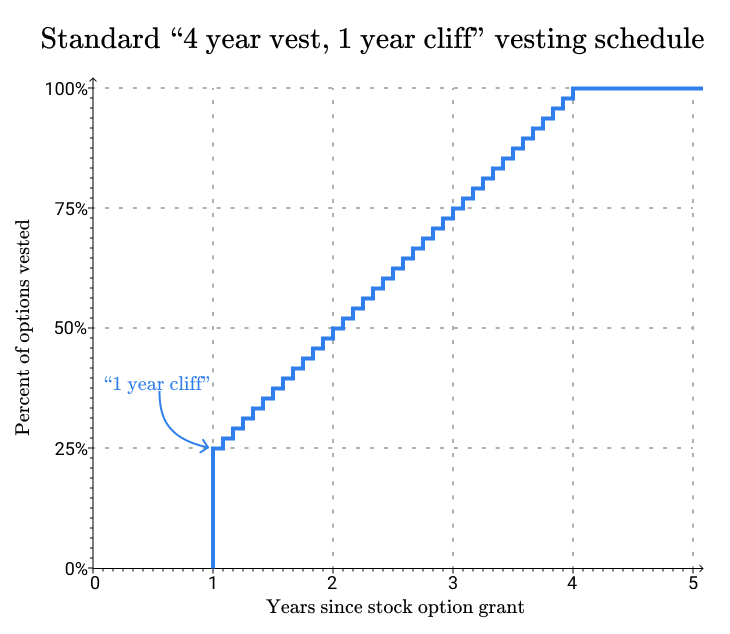 It’s worth mentioning that many companies do an equity refresher program, where employees are granted additional equity after they’ve been at the company for a while. This is important to mitigate their total compensation decreasing dramatically once they’ve completed vesting their initial grant.