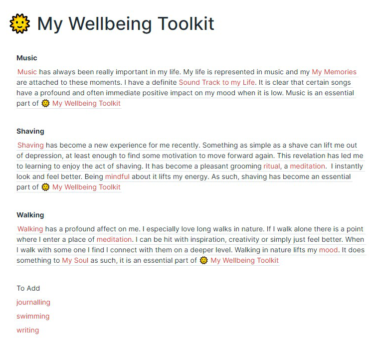 Remember you are making your own personal Toolkit. Mine contains favourite walks, even down to what season I prefer. I also have entries on which people I like as company and the times when I prefer to be alone.