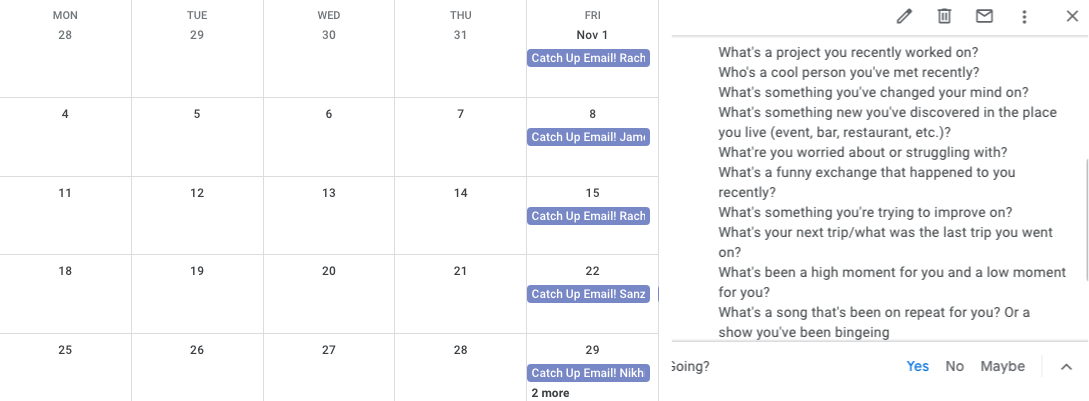 Systematic spontaneity is basically setting up processes to make sure you’re catching up with someone, but without it seeming robotic or inorganic. One thing I do, for example, is called text roulette. A couple times a week when I’m waiting for something, I’ll basically just scroll very fast through my messages and arbitrarily stop and pick a random person on that page to hit up and ask if they wanna catch up/do a call sometime. Usually it ends up being someone I haven’t talked to in a couple of months.