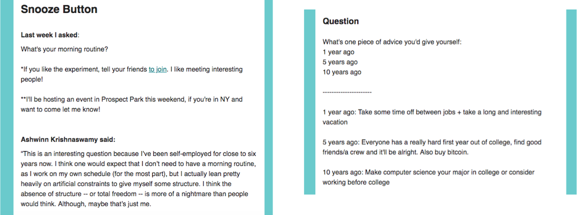 The newsletter experiment I’ve been running for the last two years is really meant to address all of the above. I ask one question per week, answer that question, and then post my favorite 3 answers in the newsletter the following week. I respond to everyone that sends me a response either way. The questions range from life tips, to deep introspection, to debates on a specific topic. I always answer and try to demonstrate some vulnerability and have found that people tend to reciprocate that.