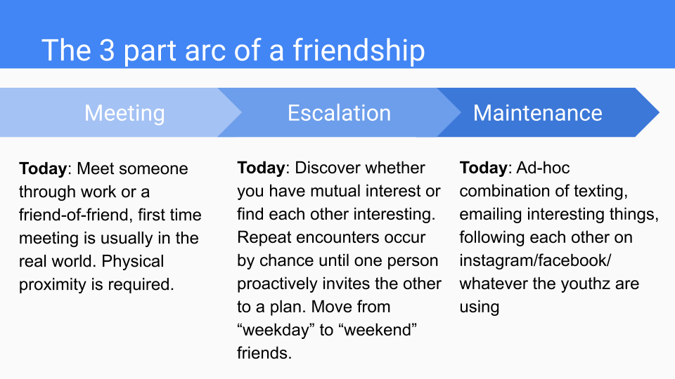 It’s this escalation that I think most people struggle with. The investment required to actually turn a meeting into a genuine friendship is difficult, and requires at least one party to start proactively reaching out and making that happen. As a friend of mine said, it’s tough to go from "weekday" to "weekend" friends.