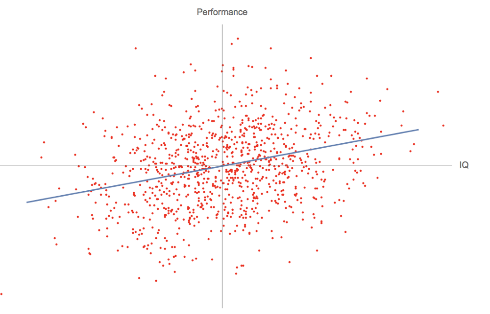 But the "intelligence" in IQ is determined by academic psychologists (no geniuses) like the "paper trading" we mentioned above, via statistical constructs s.a. correlation that I show here (see Fig. 1) that they patently don’t understand. It does correlate to very negative performance (as it was initially designed to detect learning special needs) but then any measure would work there. A measure that works in the left tail not the right tail (IQ decorrelates as it goes higher) is problematic. We have gotten similar results since the famous Terman longitudinal study, even with massaged data for later studies. To get the point, consider that if someone has mental needs, there will be 100% correlation between performance and IQ tests. But the performance doesn’t correlate as well at higher levels, though, unaware of the effect of the nonlinearity, the psychologists will think it does.(The statistical spin, as a marketing argument, is that a person with an IQ of 70 cannot prove theorems, which is obvious for a measure of unintelligence — but they fail to reveal how many IQs of 150 are doing menial jobs. So "vey low IQ" may provide information, while "very high IQ" may convey nothing better than random — it is not even a necessary condition.).