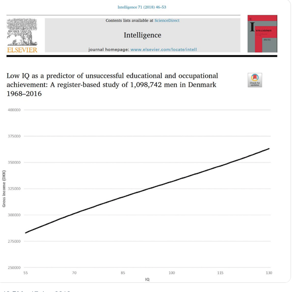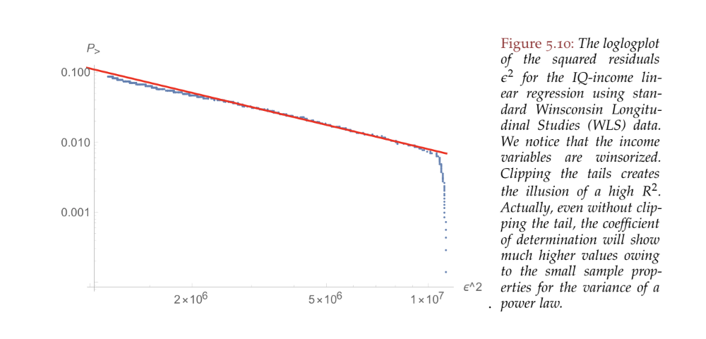 Fat Tails If IQ is Gaussian by construction (well, almost) and if real world performance were, net, fat tailed (it is), then either the covariance between IQ and performance doesn’t exist or it is uninformational. It will show a finite number in sample but doesn’t exist statistically — and the metrics will overestimare the predictability. Another problem: when they say "black people are x standard deviations away", they don’t know what they are talking about. Different populations have different variances, even different skewness and these comparisons require richer models. These are severe, severe mathematical flaws (a billion papers in psychometrics wouldn’t count if you have such a flaw). See the formal treatment in my next book.