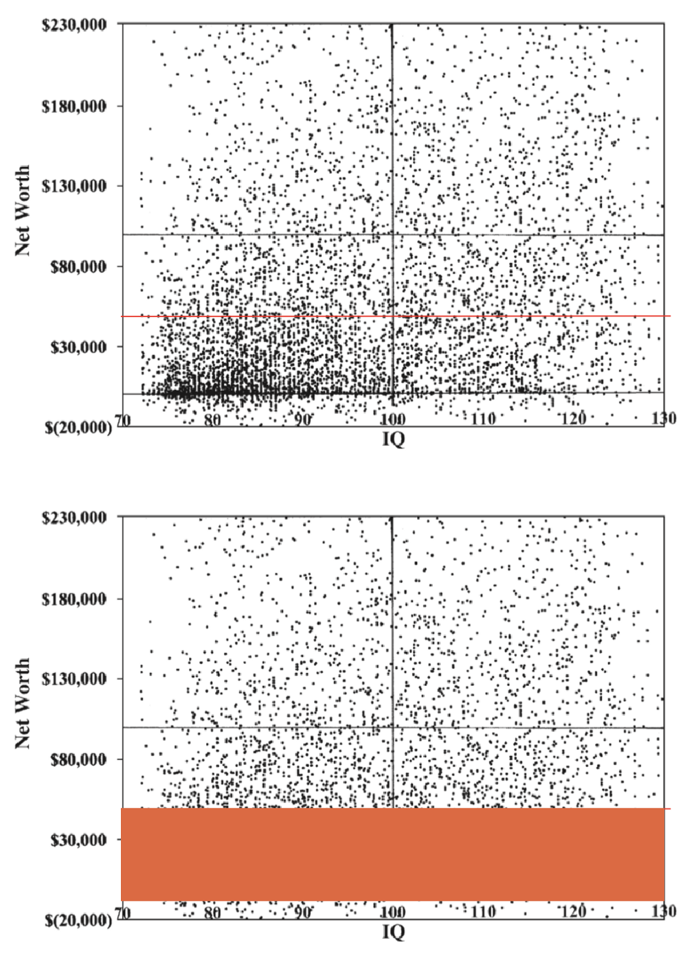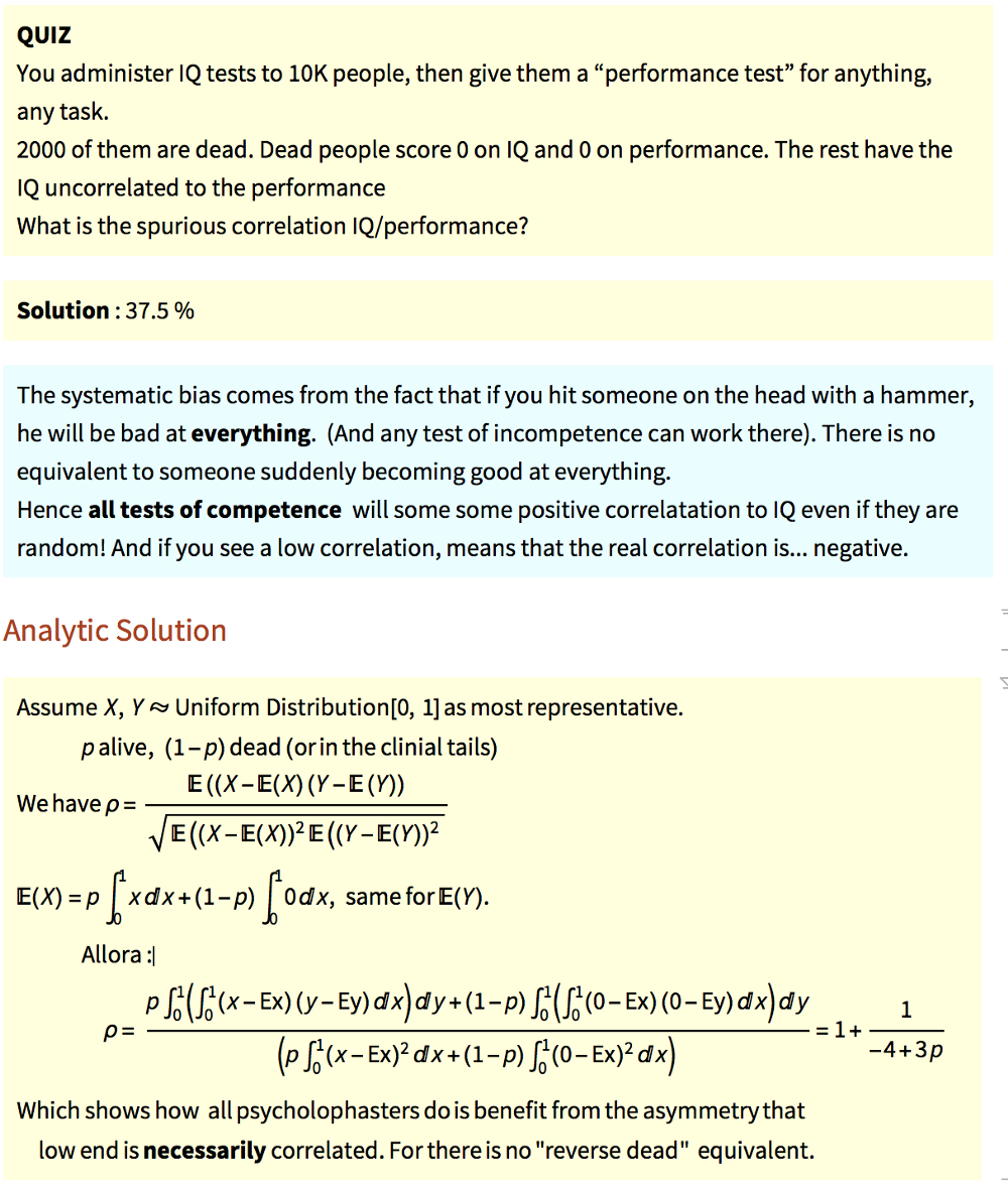 Background : "IQ" is a stale test meant to measure mental capacity but in fact mostly measures extreme unintelligence (learning difficulties), as well as, to a lesser extent (with a lot of noise), a form of intelligence, stripped of 2nd order effects — how good someone is at taking some type of exams designed by unsophisticated nerds. It is via negativa not via positiva. Designed for learning disabilities, and given that it is not too needed there (see argument further down), it ends up selecting for exam-takers, paper shufflers, obedient IYIs (intellectuals yet idiots), ill adapted for "real life". (The fact that it correlates with general incompetence makes the overall correlation look high, even when it is random, see Figures 1 and 2.) The concept is poorly thought out mathematically by the field (commits a severe flaw in correlation under fat tails and asymmetries; fails to properly deal with dimensionality; treats the mind as an instrument not a complex system), and seems to be promoted by