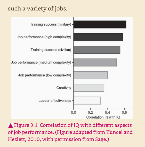 - "IQ" is most predictive of performance in military training, with correlation~.5, (which is circular since hiring isn’t random and training is another test).
