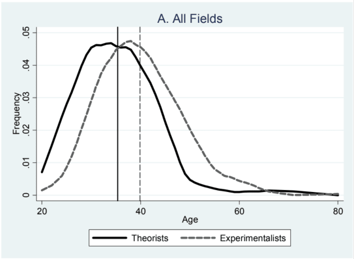 Scientific success has typically been associated with middle age, and in physics was thought to be strongly correlated with youth. Recent work has shown it to be evenly spread across people’s lives. As Jones, Reedy and Weinberg remind us, ‘Copernicus completed his revolutionary theory of planetary motion around age 60.’ The difference between conceptual and experimental thinkers we saw in writers is also seen in Nobel prize winning scientists, with the average age for empirical winners being older than that of theoretical winners.