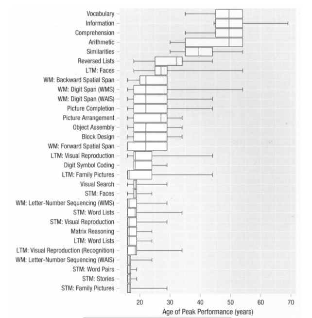However, we now know that people peak cognitively for different abilities at different ages. Hidden within the averages above are some significant variations. Raw speed in processing information appears to peak around age 18 or 19. The ability to recognise faces improves until your early 30s, as does visual short term memory. Evaluating other people’s emotional states peaks in your 40s or 50s. Vocabulary can peak as late as your 60s or 70s. You can see from this table that there is considerable range in when various functions peak.
