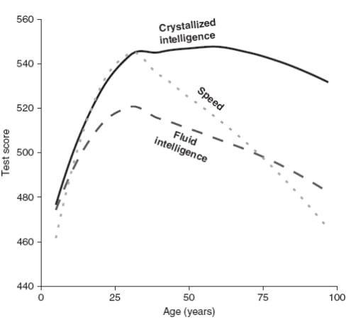Scientific work has shown that while fluid intelligence declines relatively young, concrete intelligence continues to strengthen until much later in our lives. The distinction between fluid and concrete intelligence (the difference is between dealing with novel problems vs being expert in something) is a blunt one. But it does help us see clearly that we are better at the sort of thinking that assimilates and responds to new issues better when we are young. This is, for example, why poets are often very young but few historians are.