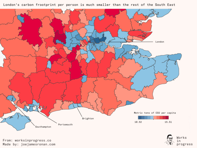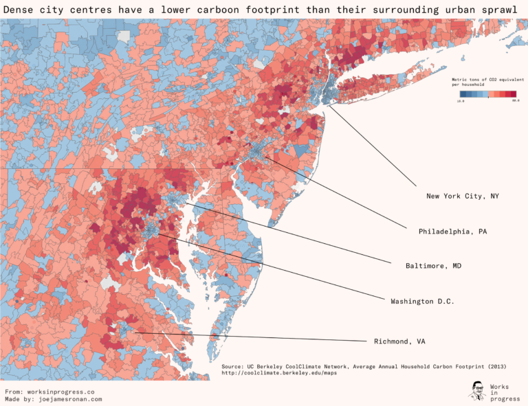 Maps of the UK and US East Coast show clearly how the densely populated parts of cities like New York, Philadelphia and London emit far less carbon per head than the rest of the surrounding sprawl. The UK’s Centre for Cities estimated that people living outside cities accounted for 50% more carbon emissions than those living inside them.