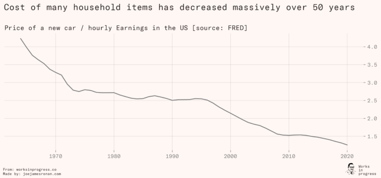 So while other durable goods have become cheaper over time, housing has become more expensive. Even though incomes have risen, both parents in a family now typically have to work to afford a decent family house in a major city, and people have had to move farther and farther outside city centres to find somewhere they can afford to live, spending more time and money on commuting to and from work.