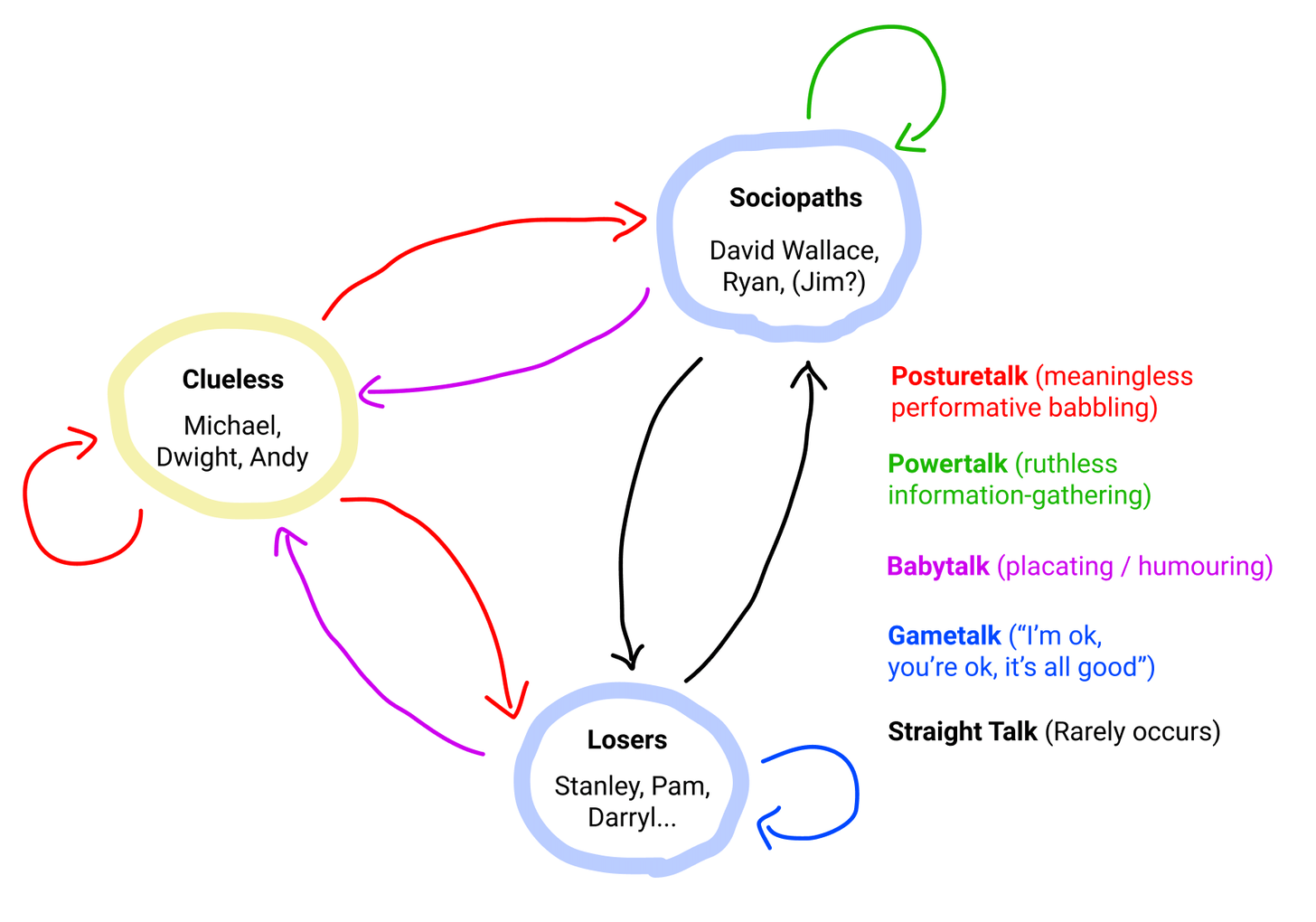 The three other languages spoken, which don’t involve the Clueless, are Powertalk (the Sociopaths’ internal language, which is entirely about competitive information-gathering and retroactive deniability), Gametalk (The Losers’ internal language: recurring games or coded rituals to get through the day), and the rare instance where Corporate actually speaks directly with the losers: Straight Talk. It’s the one and only time where people actually speak directly, with zero encoding.