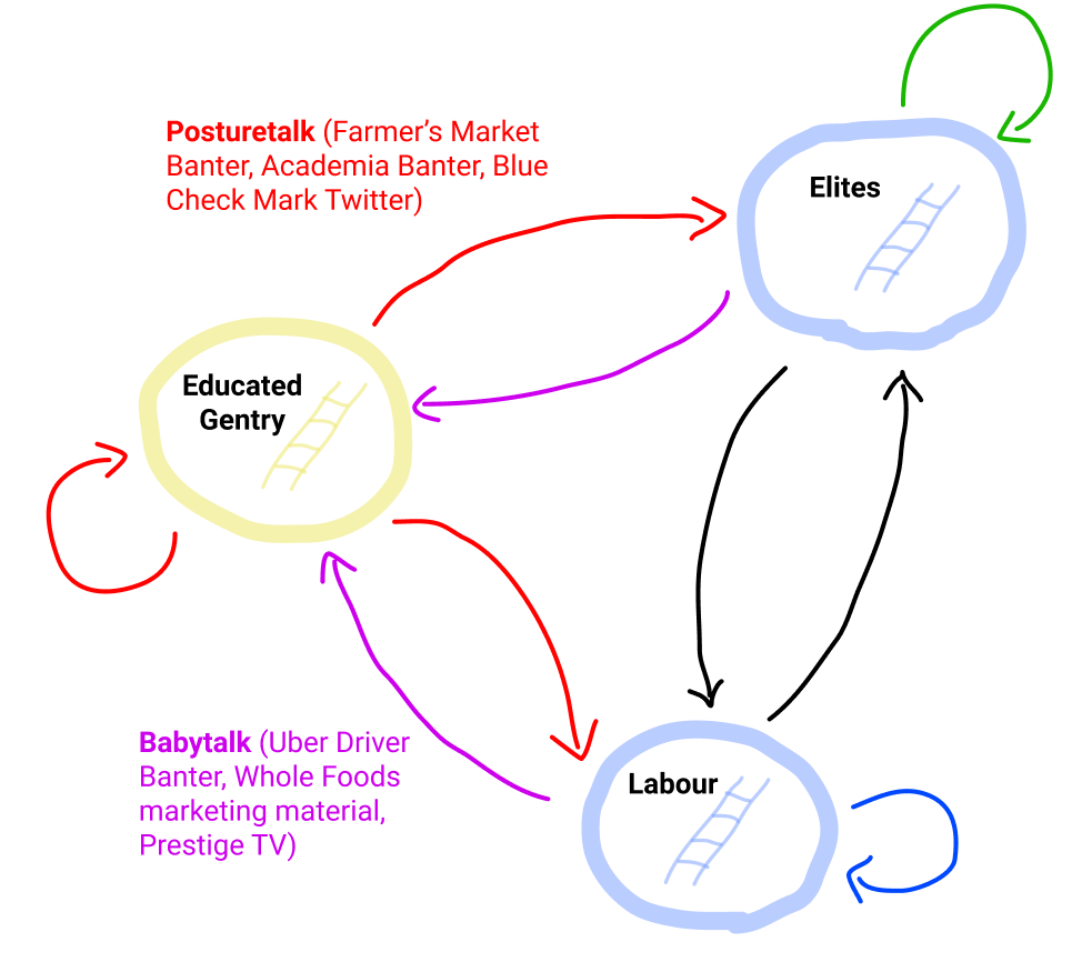 So some examples of Posturetalk (the Educated Gentry talking to anyone; but mostly to each other) include Farmer’s Market Banter ("Praise me for how sustainable I am"), Academia Banter ("Validate my obscure pursuits") and Blue Check Mark Twitter ("Enshrine my Takes"). Examples of Babytalk (speaking to the Educated Gentry) include Uber Driver Banter ("I’m willing to entertain this conversation but please give me a 5-star rating, I really need it"), Whole Foods Marketing material ("You areso wise for shopping here."), and Prestige TV ("You are so smart for watching The Good Place").