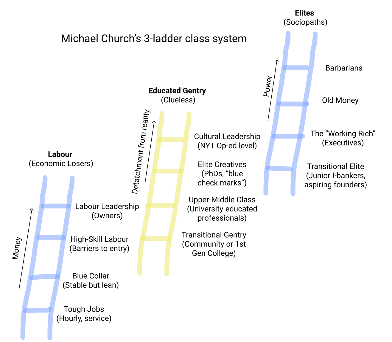At the bottom is also a transitional layer: it’s how you get onto this ladder if you weren’t born there, often via Community or 1st generation College. Above that is the upper-middle class Petite Bourgeoisie. Higher up the ladder are "elite creatives", people with obscure or virtuous-sounding PhDs, notably interesting lives, or Blue Check Marks on Twitter. (They may well earn less money than those below them on the ladder – this ladder isn’t about income.) At the very top of this ladder is an exclusive group: "Cultural leadership". The litmus test for attaining this group is, "could you write an opinion piece in the New York Times."